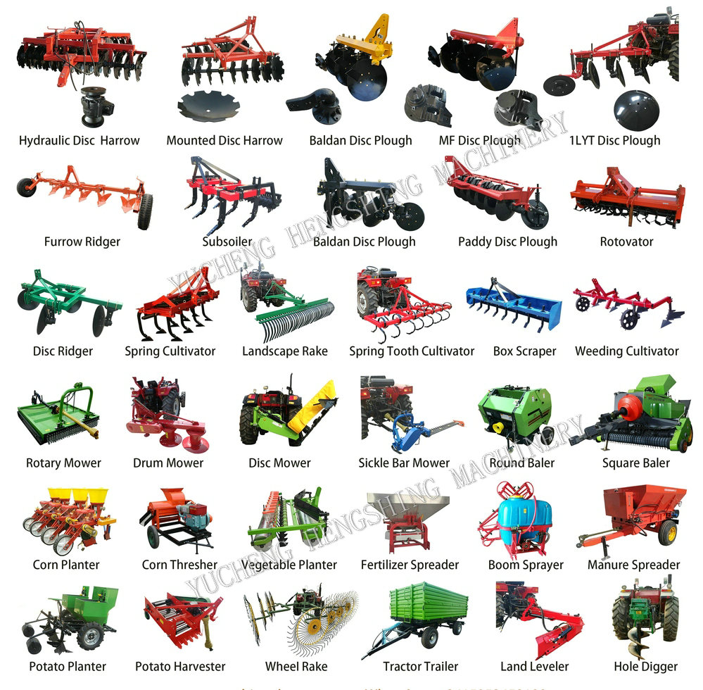 7)Cultivador8).Disco Ridger9).Distribuidor de Fertilizantes10).Broca de milho11).Broca de Trigo 12)Debulhador de milho e trigo13).Plantador de batata14).Colhedora de Batatas 15).Pulverizador de lança16).Ancinho de feno17).Escavador de buracos18).Peças Agro.